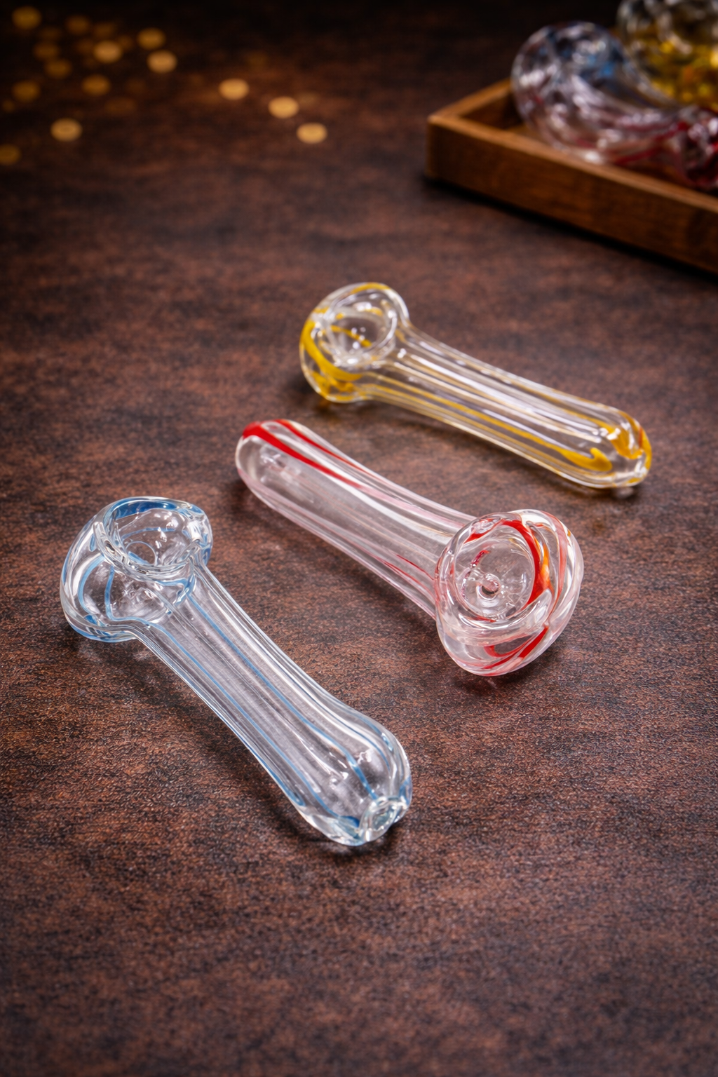 Clean, hard-hitting mini spoon with bold red, blue, or yellow accents. Simple glass, smooth pulls, built for everyday sessions.