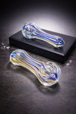 The Dual Tone Spoon Spoon brings sharp color and solid performance in one compact piece. Wrapped in bold blue and yellow streaks that cut through crystal-clear glass, this spoon pops under light and looks even better in hand.