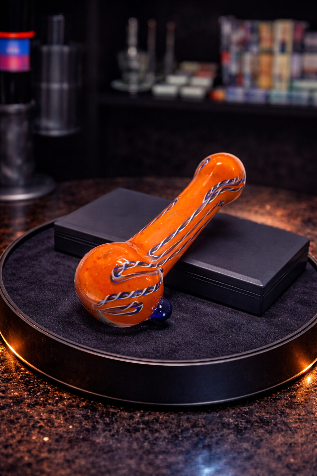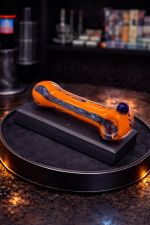 Bright molten-orange glass with deep cobalt accents — bold shelf presence, smooth pull, and built tough for everyday sessions.