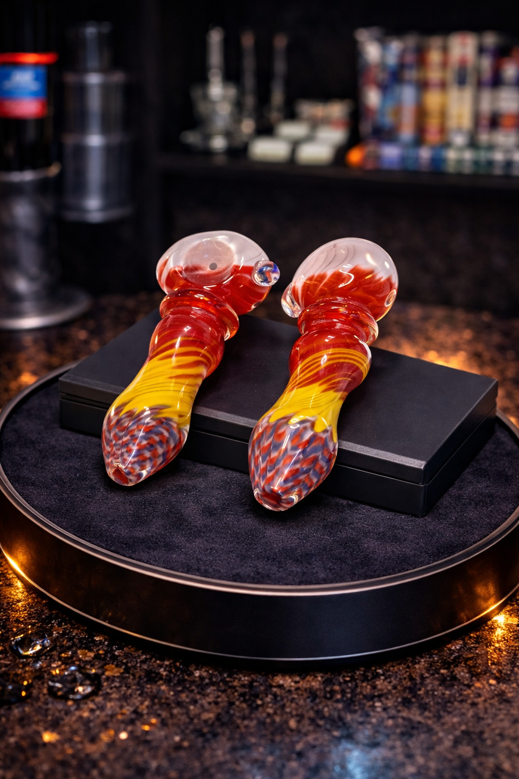 Bring serious heat to your showcase with the Sunset Blaze Spoon. This eye-catching piece blends deep red into bright golden yellow with detailed swirl accents that pop under display lighting. Itβs the kind of glass that customers notice immediately.